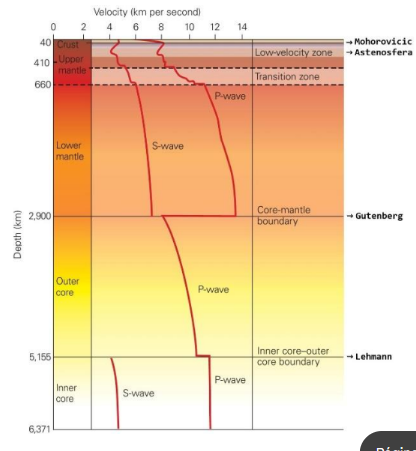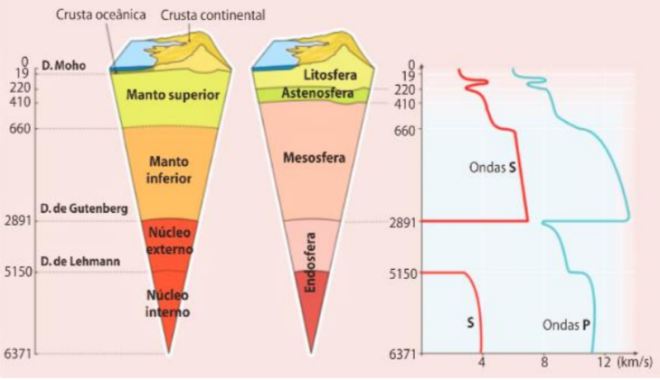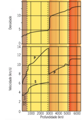A determinadas profundidades, a velocidade das ondas S e P apresenta alterações bruscas, o que indica que estas se encontram a atravessar zonas com diferenças significativas nas suas propriedades e composição – descontinuidades.