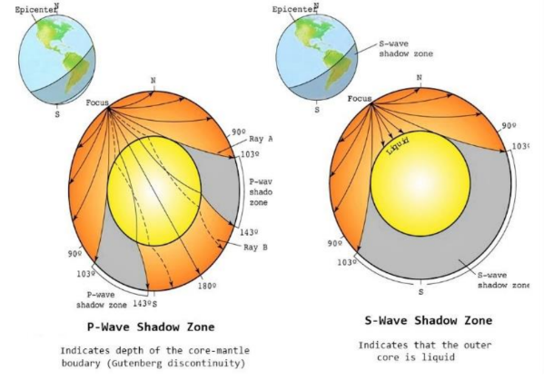 Como as ondas S deixam de se propagar e as ondas P são refratadas, existe uma zona de sombra - área da superfície terrestre onde não se registam ondas sísmicas diretas.