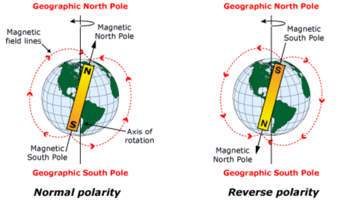 Quando o polo norte magnético se encontra perto do polo norte geográfico magnético, diz-se polaridade normal (atualidade). Quando o polo norte magnético se encontra perto do polo sul geográfico, diz-se polaridade inversa.